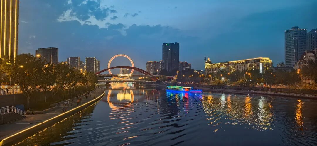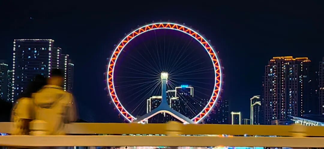 热心的出租师傅告诉了我们如何拍出天津之“眼”,尝试拍了一些照片后都不得要领。回酒店翻手机相册时突然懂了,摩天轮在水面的倒影落在桥和桥的倒影之间时,就是一只眼睛。